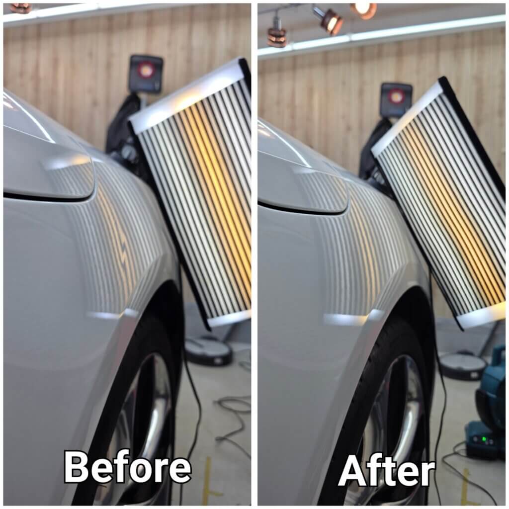 凹みの位置的に内側から押し出す事が出来ず外から引っ張り出す作業になりましたが塗装が剥がれることも無くきれいに仕上がりました。文句無しの仕上がりです。